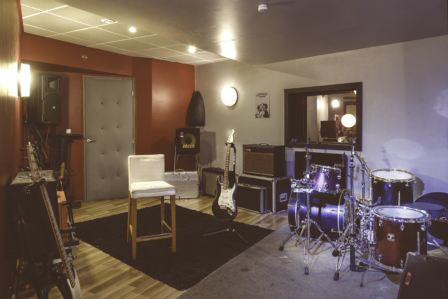 Le studio d’enregistrement comporte 2 cabines insonorisées de 24 m², chacune câblée à une régie indépendante de 13 m² cosy et chaleureuse.